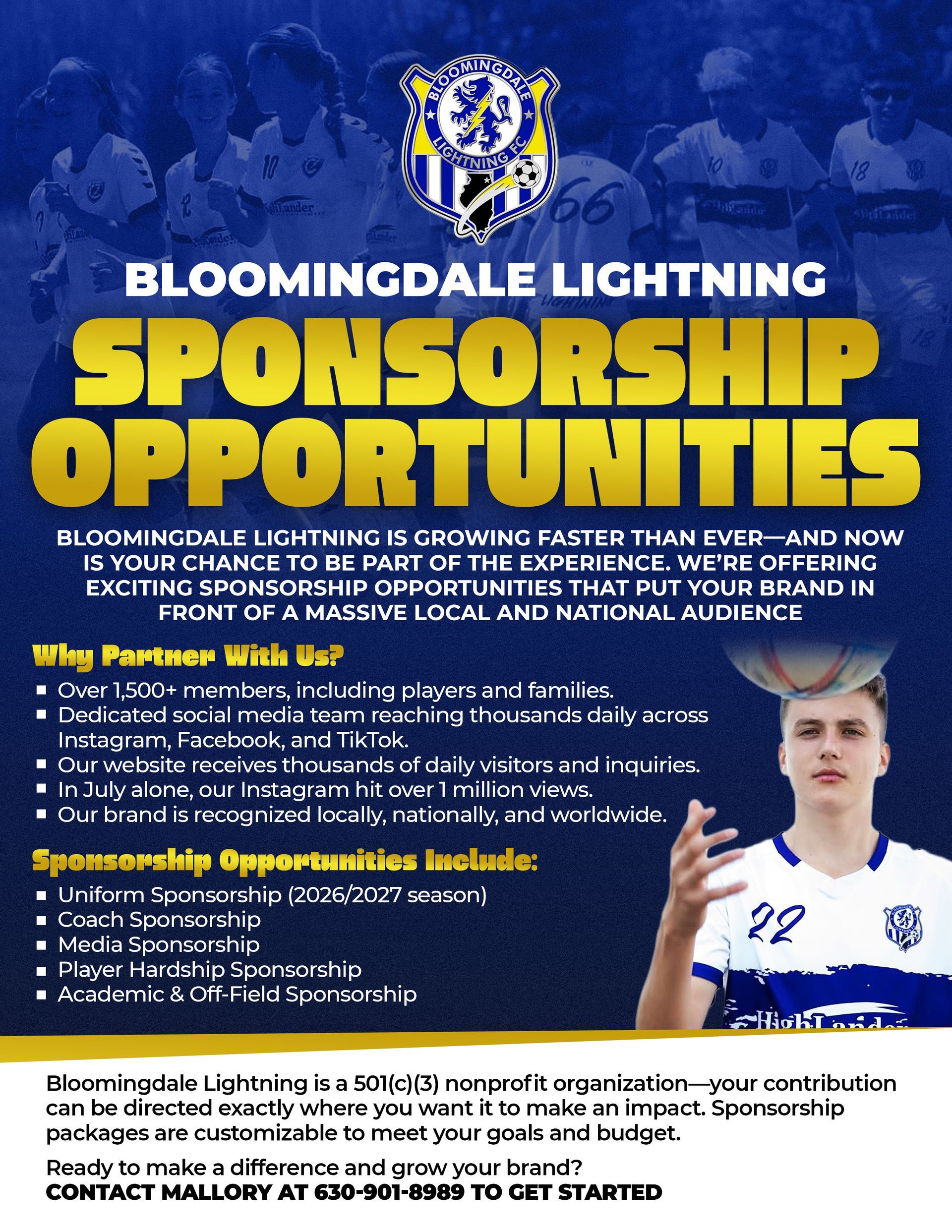 The Bloomingdale Lightning FC (BLFC) is a Not-For-Profit competitive travel soccer program located in Bloomingdale IL. Our teams compete in the Northern Illinois Soccer League (NISL), the Elite Clubs National League (ECNL), the Illinois Women's Soccer League (IWSL) and the USL youth academy league.