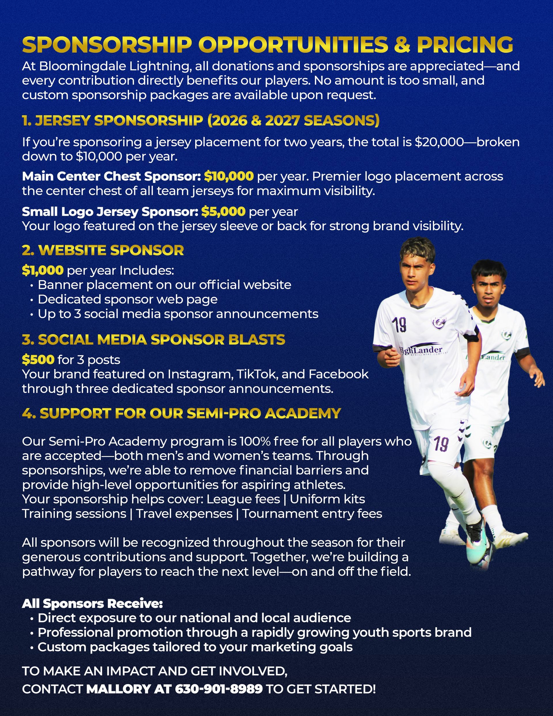 Thus when he started to become successful in his businesses, he decided that one day, one of his logos will be on the t-shirts of a soccer team. Becoming a sponsor of Bloomingdale Lightning FC is allowing his dreams to come to fruition.