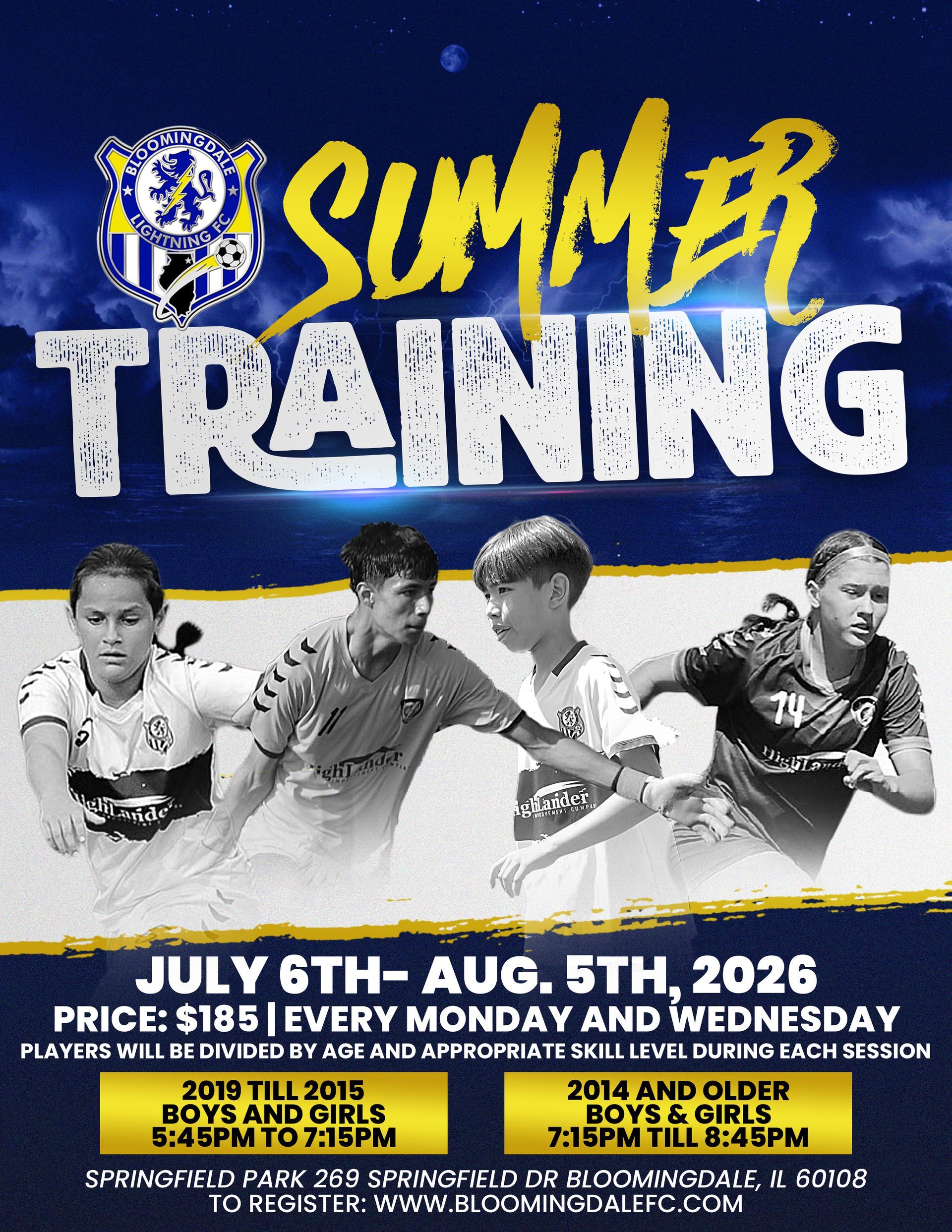 Starting July 6th, 2026 summer preparation for the upcoming fall season will begin. Players will train every Monday and Wednesday at Springfield Park in Bloomingdale. Each session will be 1.5 hours with a professional Lightning coach. Players will receive a proper technical warm-up and finish with a full game. These sessions are designed to keep our players in shape and game ready. Members only, sign up through your PLAYMETRICS account or click here to register.